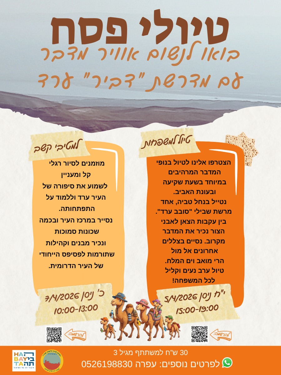 אתם מוזמנים לסיור רגלי קל ומעניין לשמוע את סיפורה של העיר ערד וללמוד על התפתחותה. נסייר במרכז העיר ובכמה שכונות סמוכות ונכיר מבנים וקהילות שתורמות לפסיפס הייחודי של העיר הדרומית.